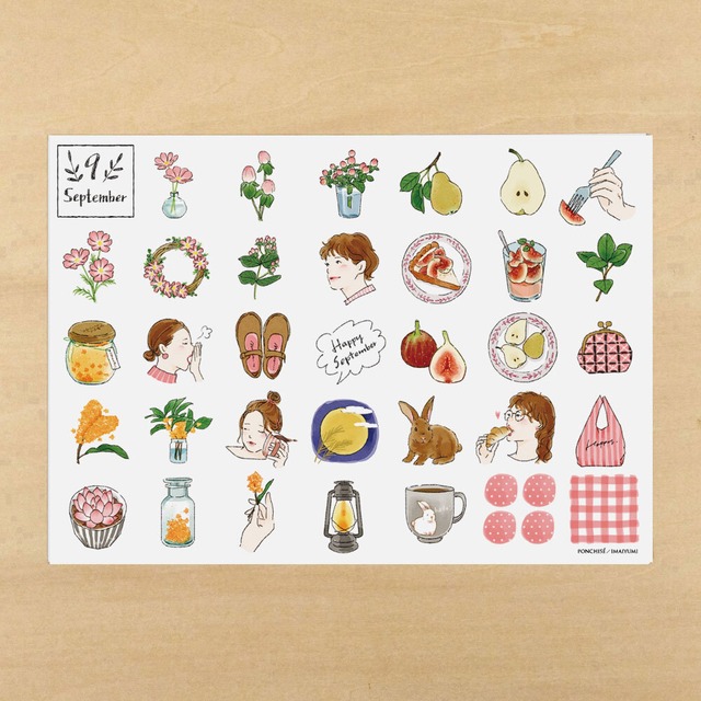 9月の季節のモチーフ31種類が詰まったマスキングシート(弱粘着シール)です。 テーマカラーは秋らしいサーモンピンクを基調に。 ヒペリカムやコスモス、旬のいちじくや梨など季節をモチーフにしたイラストをたっぷり詰め込みました。 【 バリエーション豊富な使い方が楽しめます! 】 1つのモチーフはおよそ3センチ角。 イラストだけで31種類入っていますので、毎日の日記のデコにもピッタリです。 マンスリー手帳をお使いの方は予定の入っていない日に貼ると、ページが華やかになって後から見返すのが楽しくなりますよ。 また、友達への手紙や、特別な日のギフトラッピングに使用することで、温かみをプラス。 日常のメモやジャーナルのデコレーションにも最適です。 気分を盛り上げるアイテムとして、ぜひ取り入れてみてください! シールの素材はマスキングテープと同じ和紙の弱粘着シートシールです。 貼った後でもそっとはがしてまた貼って、という使い方もできるので予定が変化しやすいあなたの手帳や日記にも重宝すると思います。 カットラインは入っておらず、ハサミで切り取ってお使い頂くタイプです。 サイズ:A5サイズ 横210mm 縦148mm ※色合いは、ご覧の環境によって異なって見える場合がございますので、あらかじめご了承ください。 自分だけのデコレーションを楽しんで、素敵な作品を仕上げましょう! 水彩画 水彩イラスト