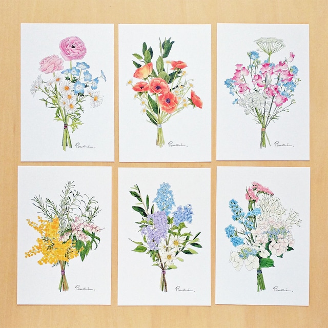 12ヶ月の花束シリーズから、誕生花の花束をポストカードにしました。 それぞれのポストカードには、幸せや幸運をもたらすとされる花々が描かれています。 1月はラナンキュラス、デイジー、ネモフィラ 2月はカモミール、ポピー、月桂樹 3月はレースフラワー、デルフィニウム、スイトピー 4月はミモザ、アセビ、ローズマリー 5月はライラック、フランネルフラワー、オリーブ 6月はかすみ草、スターチス、ガクアジサイ それぞれの月の花束ポストカードが1枚ずつ、計6枚入ってます。 各月単体での販売もございます。 同じデザインのA4ポスターもご用意していますので、ご自宅用、プレゼント用など用途に応じてお選びください。 オンデマンド印刷 紙質 ケント紙 サイズ タテ100×ヨコ148mm 各1枚 計6枚入り