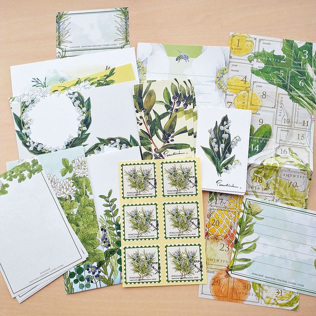 シェフにおまかせ的な感じに「デザイナーにおまかせ」の紙もの詰め合わせセットを作りました。 セットの中身は、 ●ポストカードや小さいサイズの便箋など新作や人気のある定番アイテムと ●今回だけの作り切りの限定アイテムを 箱に入るだけギッシリと詰めました。 12アイテム2000円以上入ったお得なセットです。 こちらのセットは緑色をコンセプトカラーにしています。 ・ポストカード(すずらん/草原/アカシア)計3枚 ・便箋(アネモネ) 計5枚 ・メモ紙(シロツメクサ) 計5枚 ・ミニカード(すずらん/月桂樹) 2種類 計10枚 ・ハーブ畑の平袋 1枚 ・ローズマリーのシール(4cm角) 6枚 ・メッセージカード 1枚 ・一筆箋 1枚 ・日付シート 1枚(※裏面はシールではありません) 箱のサイズ 幅150×高さ110×マチ6mm