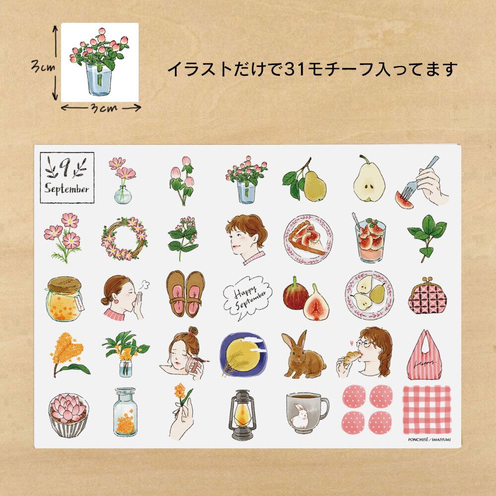 9月の季節のモチーフ31種類が詰まったマスキングシート(弱粘着シール)です。