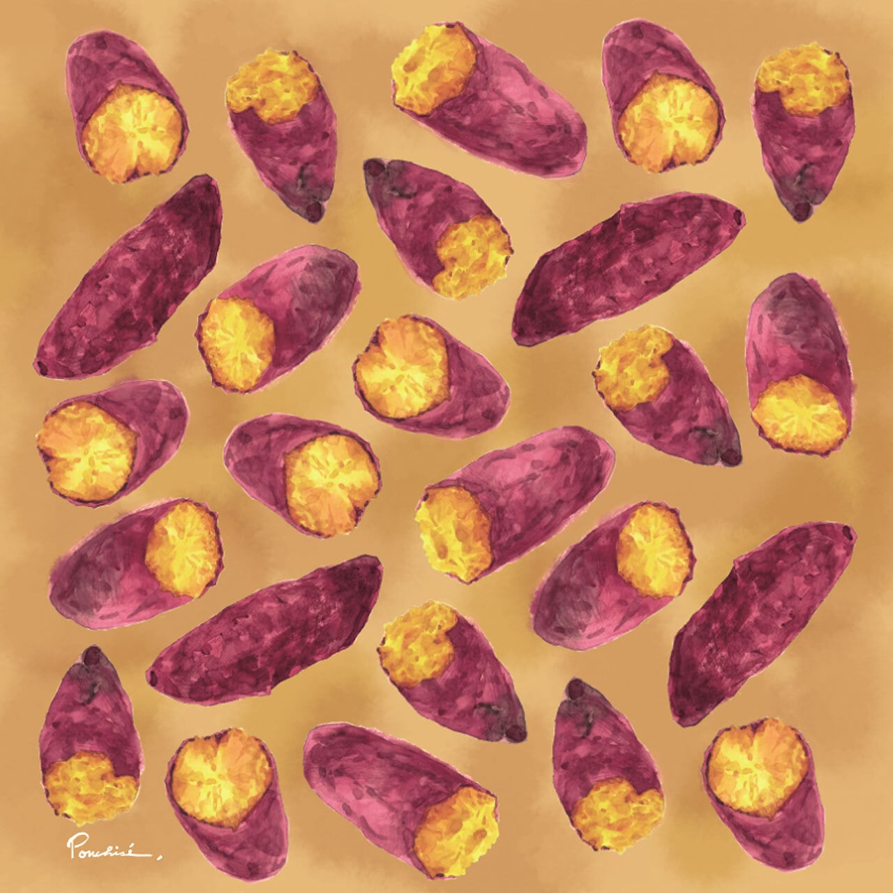 ゴロゴロ転がる焼き芋をいっぱいにデザインしてプリントしました。
