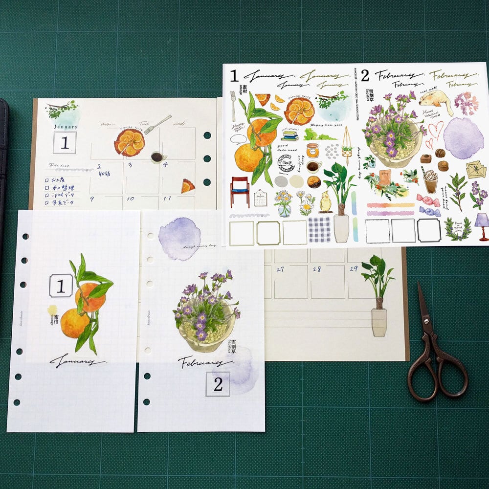 小さいパーツのイラストや絵具のニュアンス素材はスケジュールのあしらいにピッタリです。